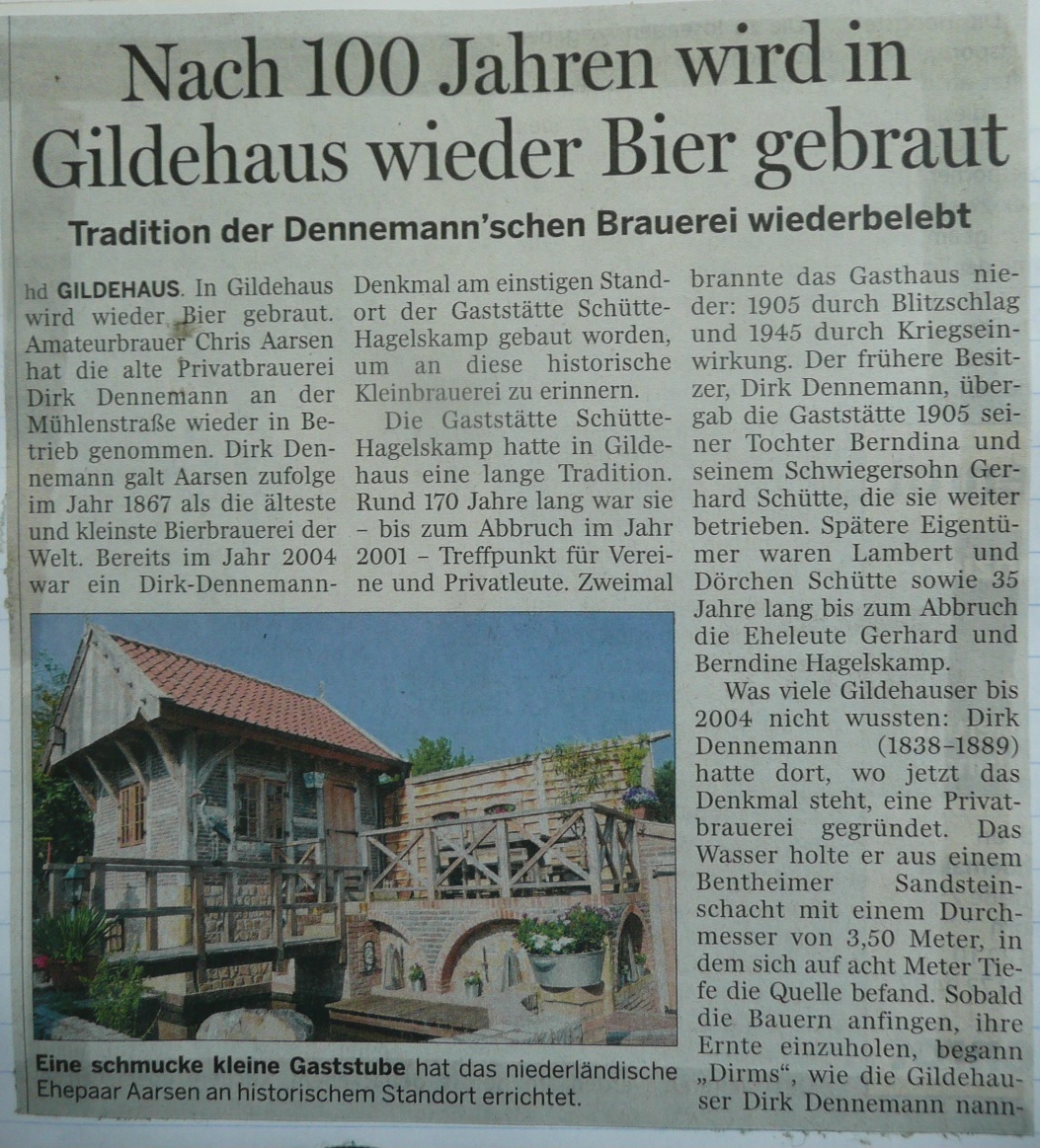 Was viele Gildehauser bis 2004 nicht wussten: Dirk Dennemann (1838–1889) hatte dort, wo jetzt das Denkmal steht, eine Privatbrauerei gegründet. Das Wasser holte er aus einem Bentheimer Sandsteinschacht mit einem Durchmesser von 3,50 Meter, in dem sich auf acht Meter Tiefe die Quelle befand. Sobald die Bauern anfingen, ihre Ernte einzuholen, begann „Dirms“, wie die Gildehauser Dirk Dennemann nannten, mit dem Bierbrauen. Kurze Zeit später konnten die Einwohner den Gerstensaft in seiner Gastwirtschaft genießen oder in Steinkrügen mit Bügelverschluss mit nach Hause nehmen.